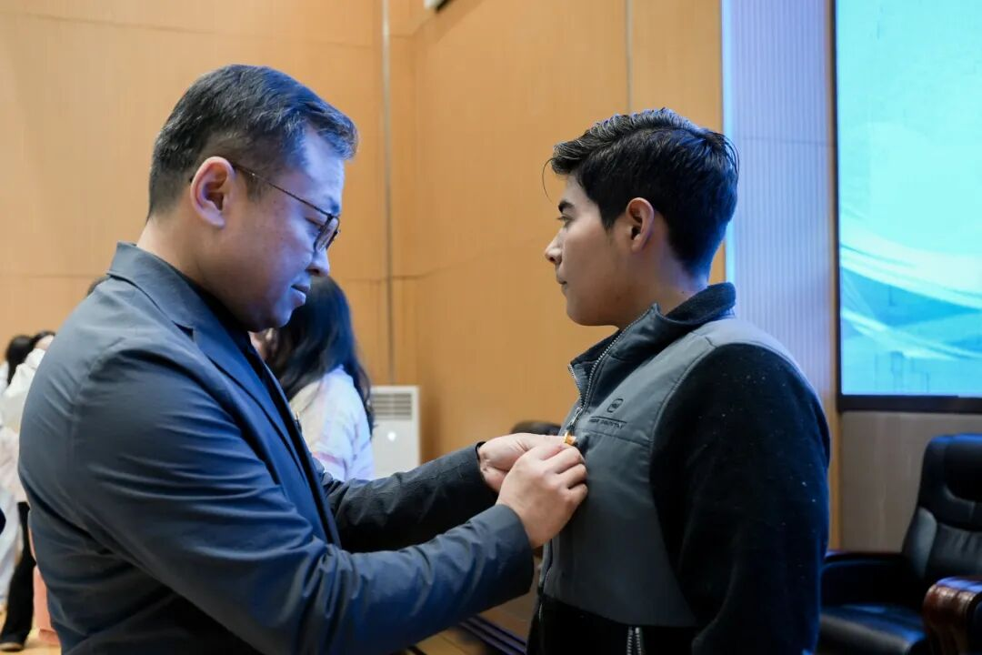 During the school badge pinning ceremony, university leaders and faculty representatives solemnly pinned the school badges on representatives of the international freshmen. Each badge not only symbolizes the acquisition of a new identity but also embodies the university’s expectations, allowing the freshmen to deeply feel the warmth and care of the university.